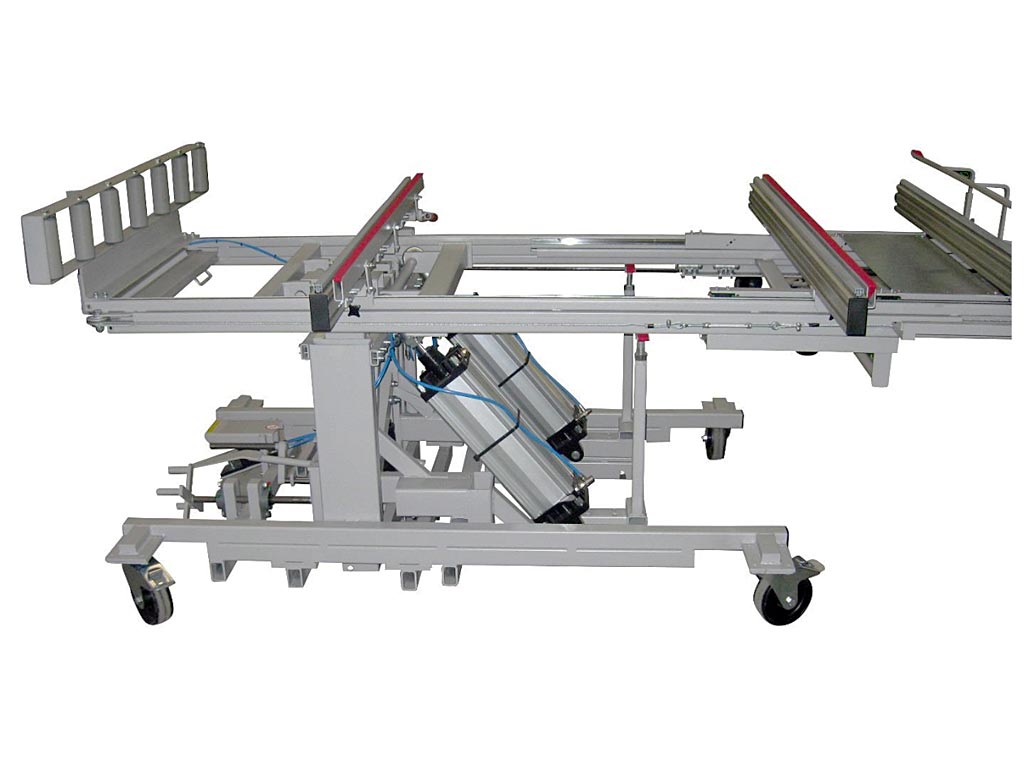 - Réglage de l’inclinaison du convoyeur à rouleaux pour faciliter l’accrochage pour accrocher le vantail dans un cadre vertical : Dispositif de levage 240 mm électrique avec fonctionnement sur batterie ou 275 mm hydraulique par pompe à pied.